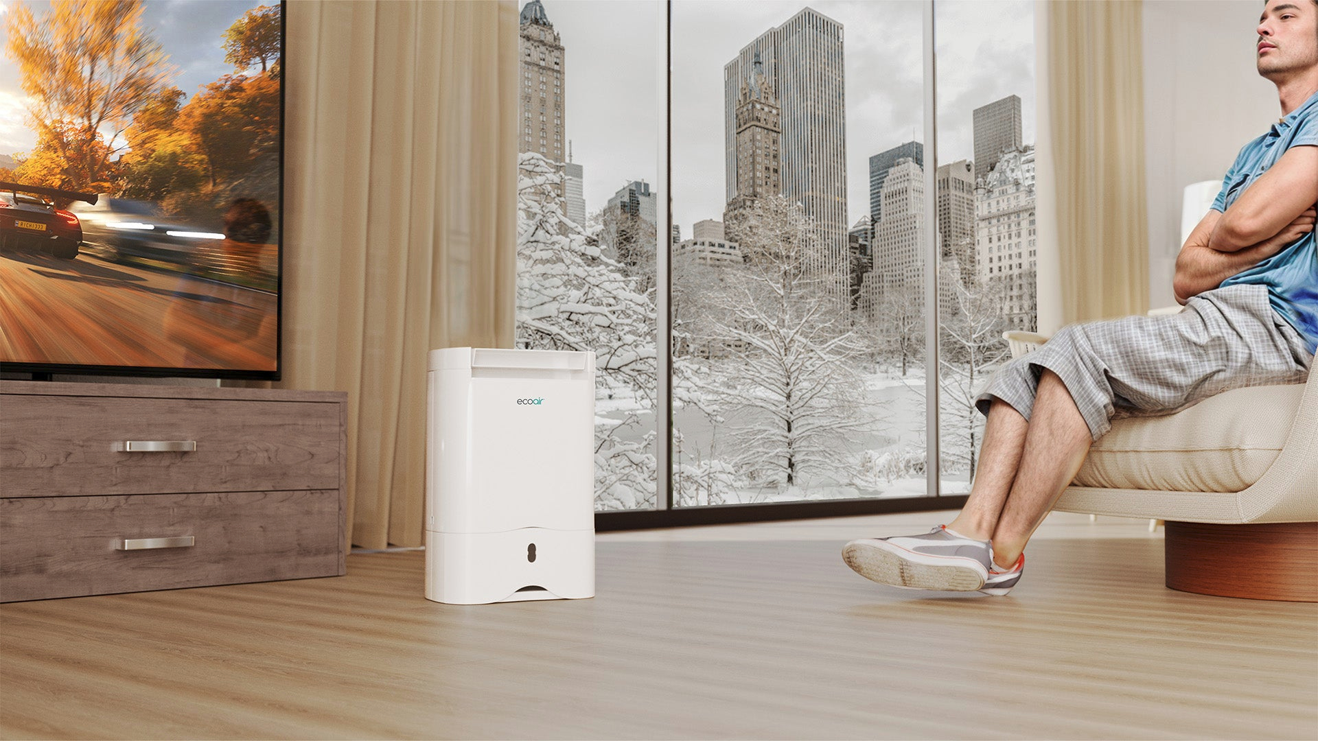 Le déshumidificateur DD3 Slimline d'EcoAir élimine jusqu'à 10 litres d'humidité par jour à l'aide d'un agent adsorbant plutôt que d'un compresseur. Avec une largeur de 31,7 cm, l'EcoAir DD3 Slimline est très peu encombrant.