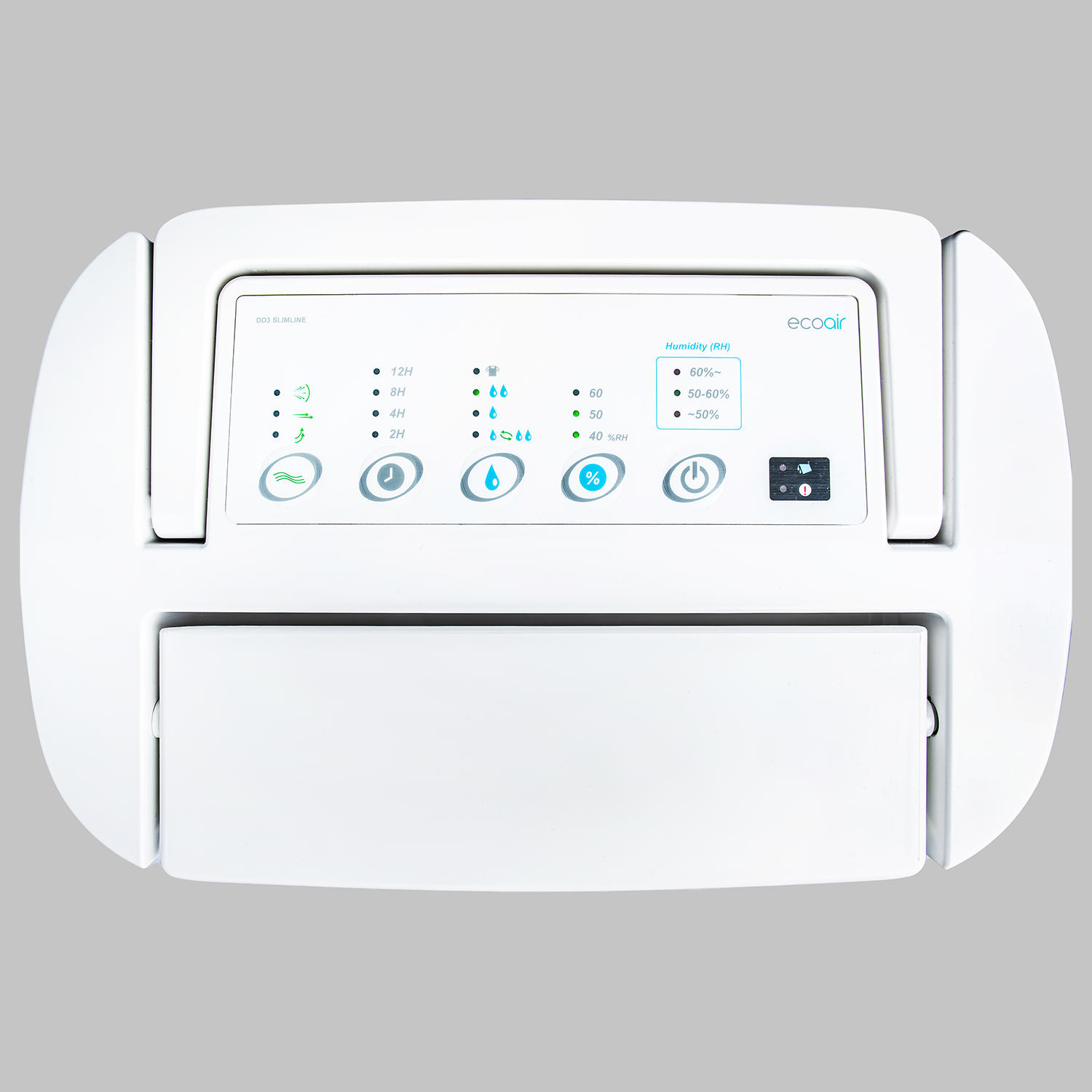 La technologie E7 d'EcoAir détecte la température ambiante et l'humidité de l'air, et bascule automatiquement entre les modes pleine puissance, ECO et veille. Une fois l'humidité souhaitée atteinte, le déshumidificateur à adsorption passe automatiquement en mode ventilation. Dans ce mode, l'air ambiant circule et le déshumidificateur mesure les données en temps réel pour vérifier l'état de l'air. Grâce à la technologie E7, le DD3 Slimline gère et régule avec précision les niveaux d'humidité.